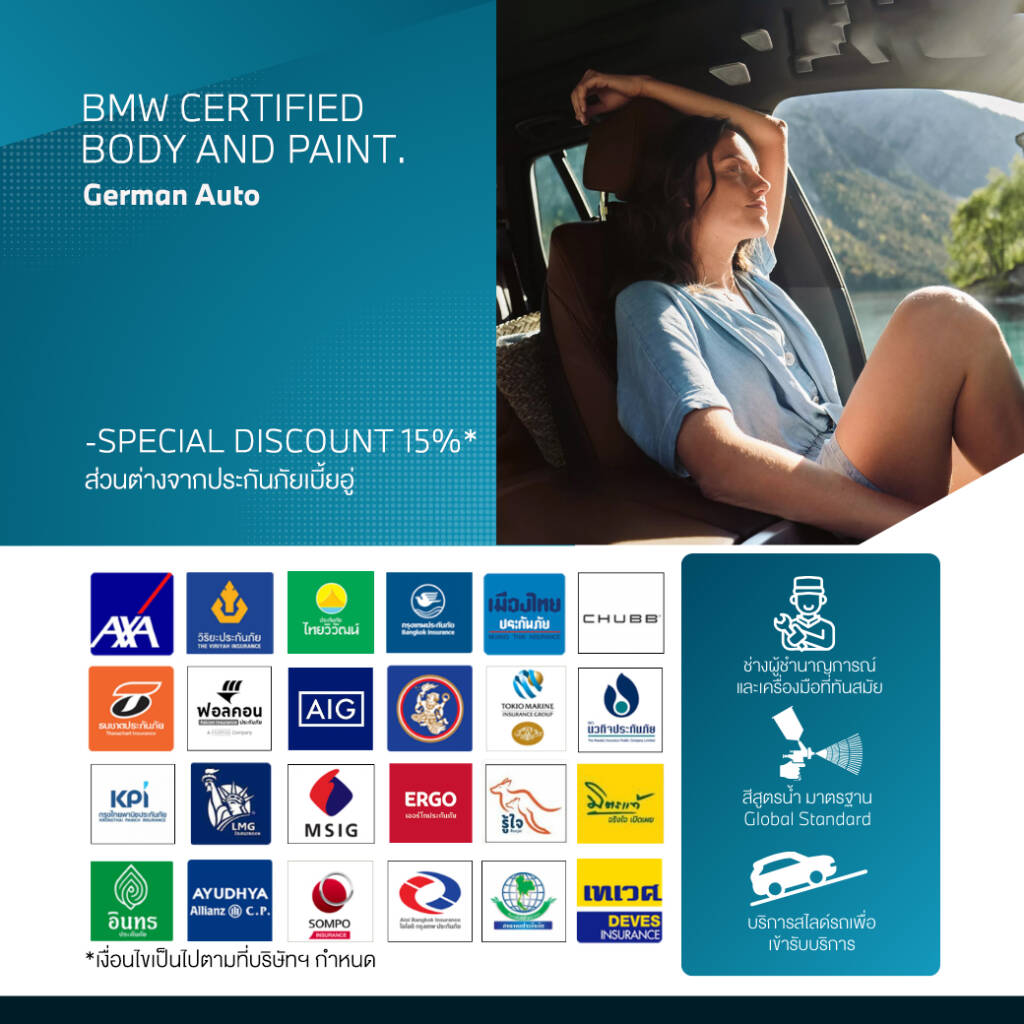 ศูนย์บริการดูแลตัวถังและสีที่ได้รับการรับรองจาก BMW ที่จะทำให้รถของคุณกลับมาสมบูรณ์แบบเหมือนวันแรกที่ร่วมทางด้วยมาตรฐานการบริการที่อยู่ภายใต้การดูแลของผู้เชี่ยวชาญตัวจริง ทำให้คุณมั่นใจได้ว่ารถที่คุณรักจะได้รับการซ่อมแซมให้กลับมาอยู่ในสภาพเดิม